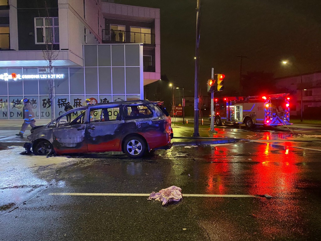 本那比皇家騎警在推特上發布了壹張被大火燒焦的出租車照片,顯示撞車的嚴重程度。警方稱事件發生在凌晨2點30分,出租車司機在大火中逃生。