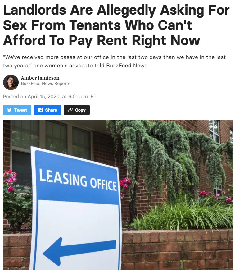 據稱,現在有壹些房東利用這次危機作為性騷擾弱勢租戶的機會。