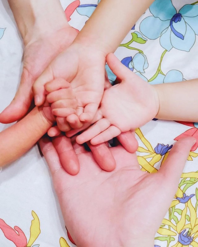 在丈夫橘慶太分享的配圖上,兩只大手墊著叁只肉乎乎的小手,組成了這個伍口之家。