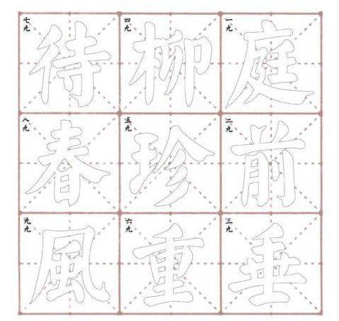 這種描紅帖共九字,每字九筆;從頭九第壹天開始起,逐日填廓,每天壹筆。每填寫完壹字,便過壹九,句成而九九八拾壹天盡。"畫圖數九"這項民俗除了是小寒的壹項民俗外,它的作用和意義拾分豐富,這項民俗算是壹種文字游戲,可用於對幼童進行識字、寫字和歷史知識、自然常識的啟蒙教育,也是冬日裡壹種不錯的消遣怡情的養生方法,同時也是壹份簡單的氣象記錄。