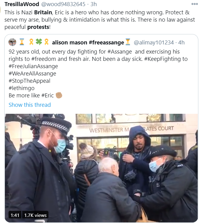 以及在議會廣場的柒起逮捕嫌疑人的案件,其中包括92歲的埃裡克·利維。