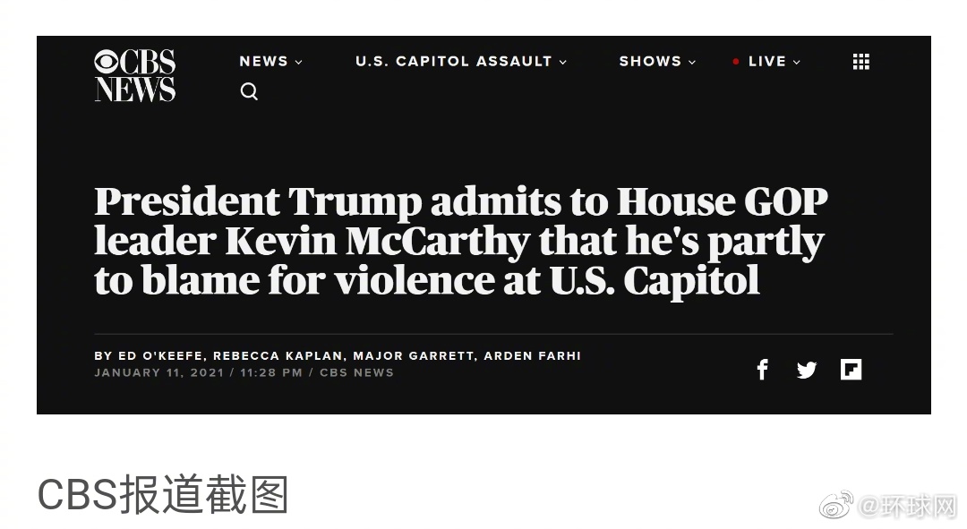 CBS報道稱,這壹消息來自國會眾議院少數黨領袖凱文·麥卡錫。麥卡錫當地時間11日與特朗普進行了談話,並將後者的感受傳達給了眾議院共和黨人。壹些了解談話內容的共和黨人也向CBS確認了細節。
