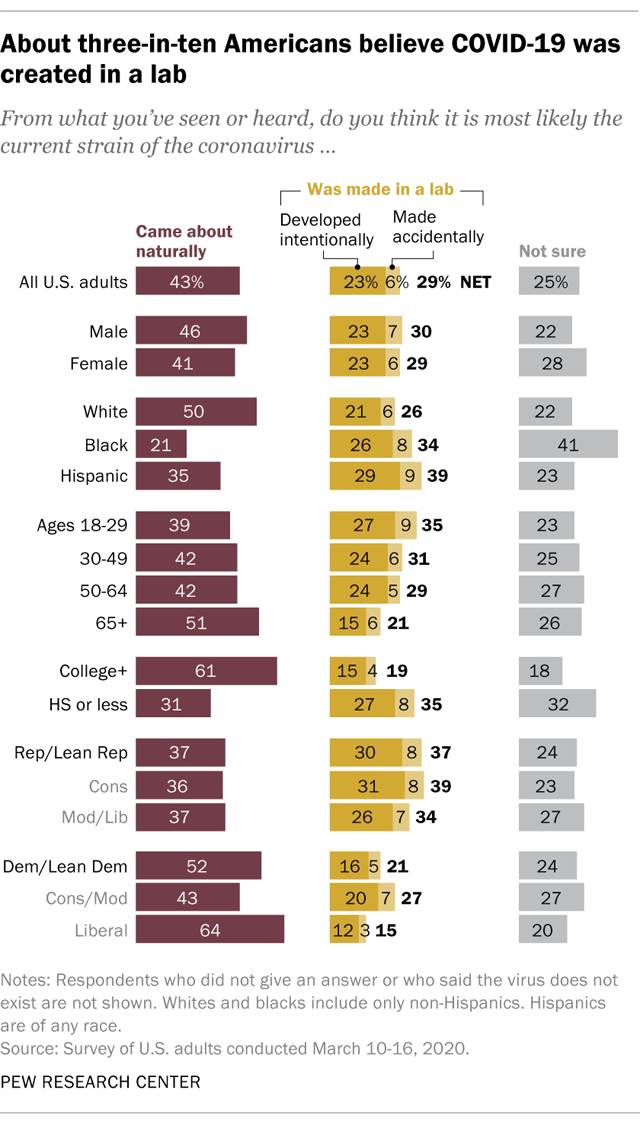 2020年4月,美國皮尤研究中心的壹份調查結果顯示,在被調查民眾中,近叁分之壹的人認為病毒極有可能是在實驗室中產生的。當然,當時美國滿大街宣傳病毒是“從武漢傳出去的”,美國的政客花大力氣誤導民眾,就像蓬佩奧所說,美國中情局的特長就是教人撒謊,而這近叁分之壹的民眾普遍受教育水平低並且大部分都是支持共和黨的保守派。