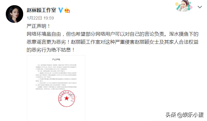 可是近段時間網絡上卻出現了很多關於兩人離婚的各種消息,甚至還傳出孩子不是馮紹峰的,因此也引發了壹系列的網友爭議。直到近日,趙麗穎馮紹峰工作室終於發出聲明,回應了離婚和孩子爭議問題,趙麗穎工作室發布驗證聲明,對於侵犯趙麗穎及家人合法權益的惡意行為絕不姑息。對於不刪除繼續侵權趙麗穎的網絡用戶將訴諸法律。雖然趙麗穎工作室此次發布的聲明當中沒有提具體是什麼事,但是很明顯是在回應涉及到趙麗穎和孩子,否則也不會提到家人。