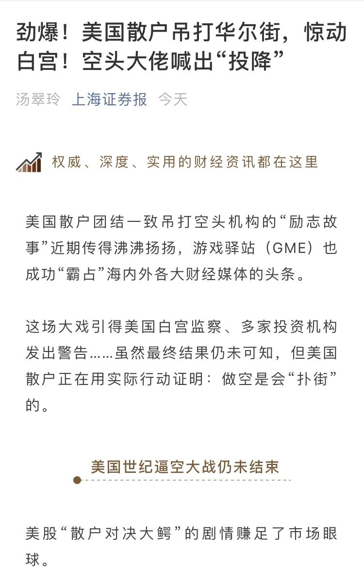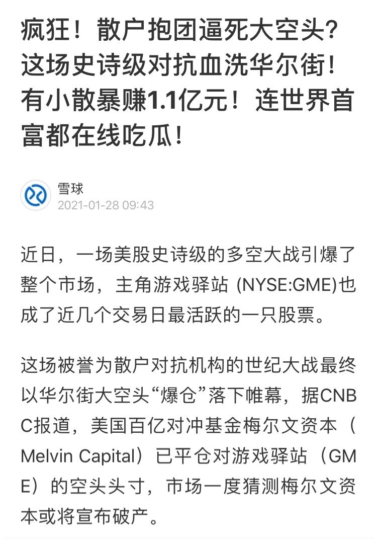 有人戲稱,這是壹場美股散戶多頭與華爾街機構空頭之間的“世紀逼空大戰”,不少圍觀資本市場這場好戲的網友高呼,以前都是機構割“韭菜”,現在終於輪到“韭菜”把機構割了!