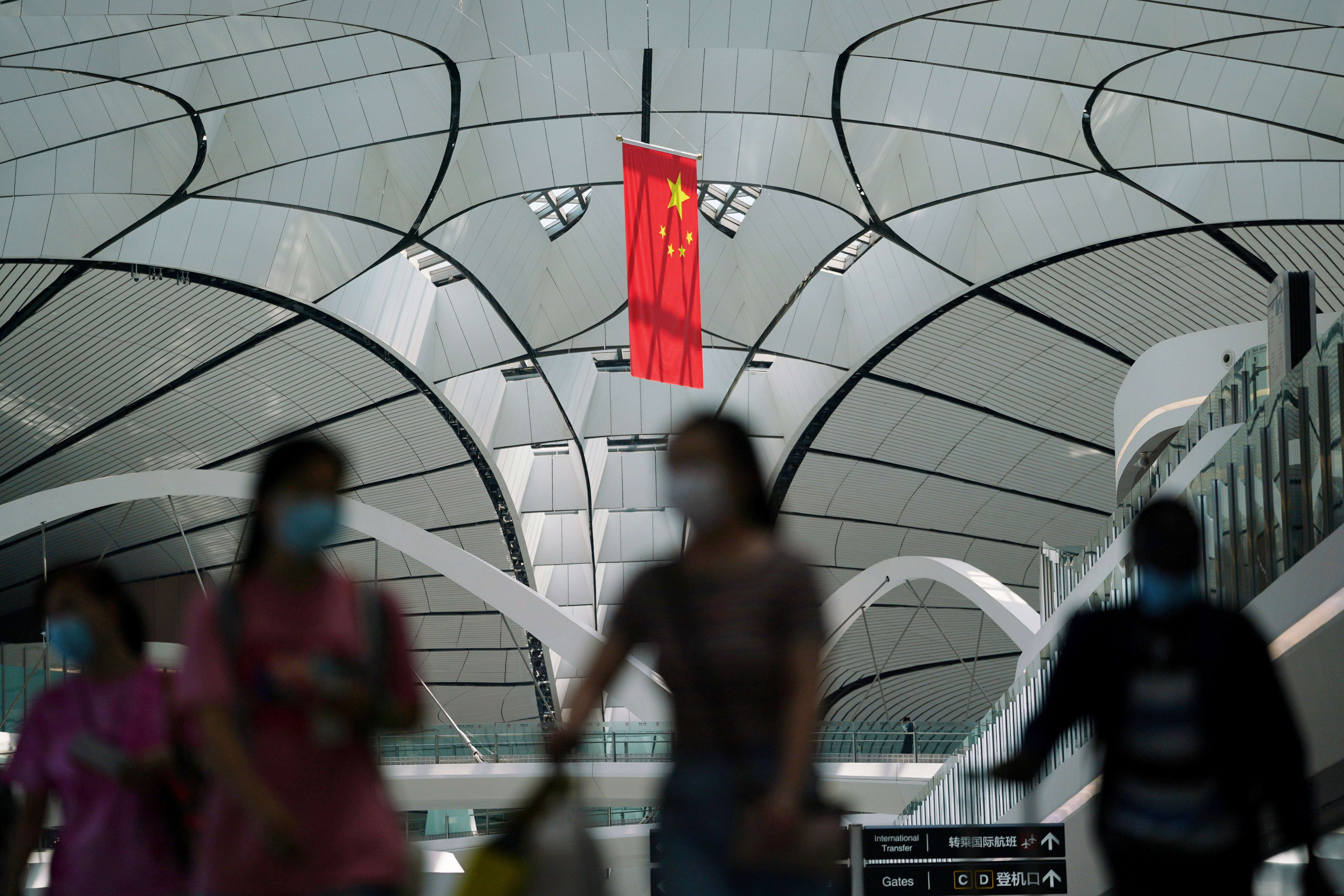 2020年7月24日,北京大興國際機場,人們戴著口罩走過壹面中國國旗。