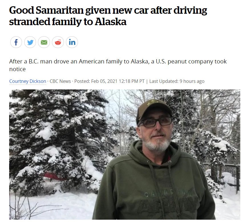 (加西網綜合)疫情下的暖心故事,來自BC省聖約翰堡的壹名好心人,盡全力幫助美國居民與阿拉斯加邊境的家人團聚。