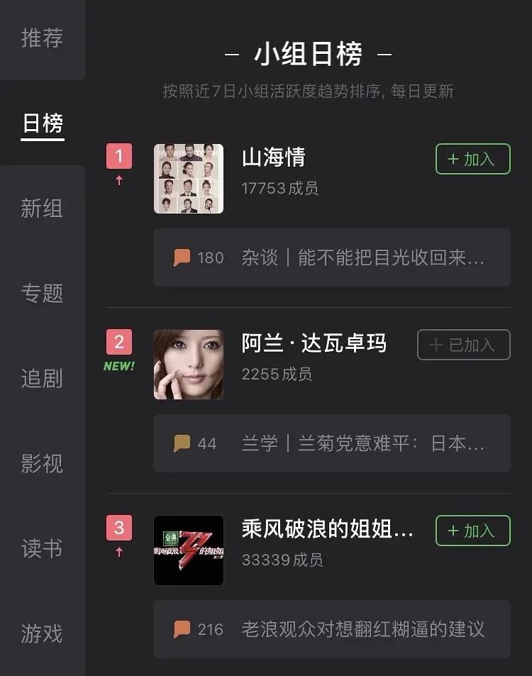 看豆瓣日榜,阿蘭小組組員僅兩千,卻力壓浪姐拿下全站第贰熱度。