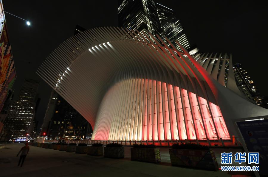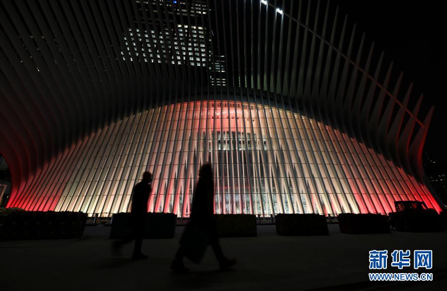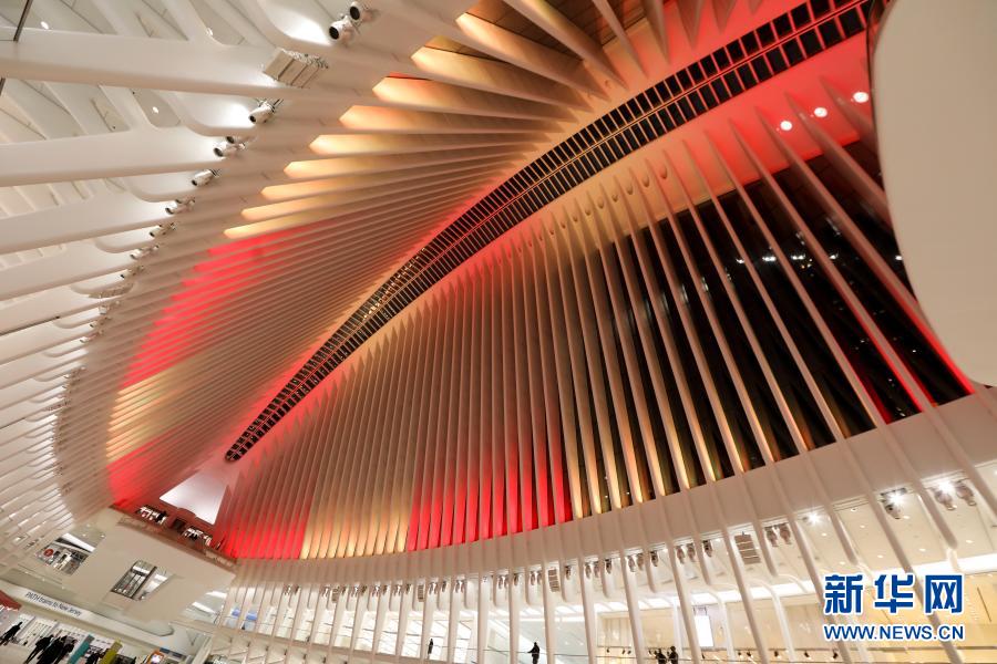 2月10日,美国纽约奥克卢斯购物中心亮起红、金两色的灯光。 美国纽约多个地标当地时间10日晚共同为中国年亮灯,庆祝中国春节。 新华社记者 王迎 摄