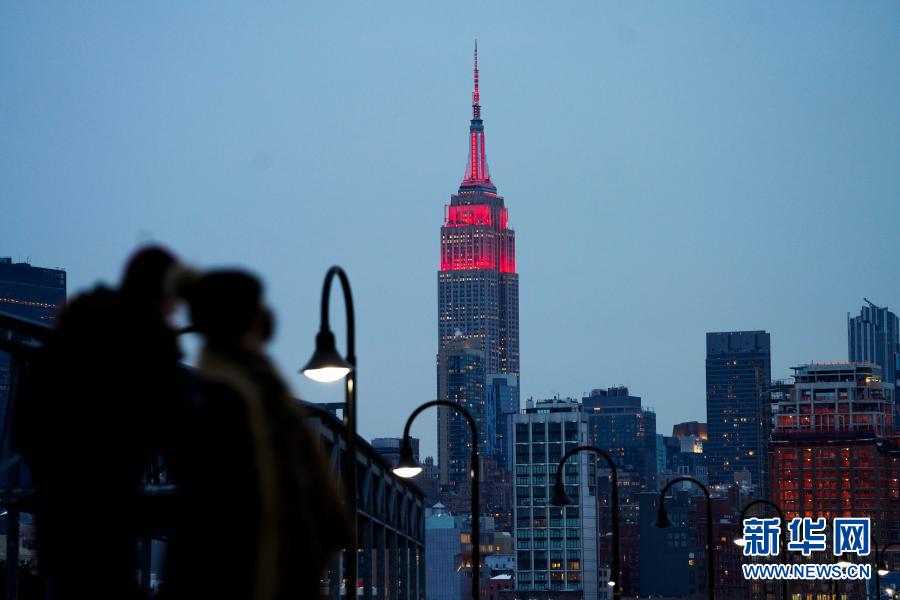 2月10日,美国纽约帝国大厦亮起红色灯光。 美国纽约多个地标当地时间10日晚共同为中国年亮灯,庆祝中国春节。 新华社记者 王迎 摄