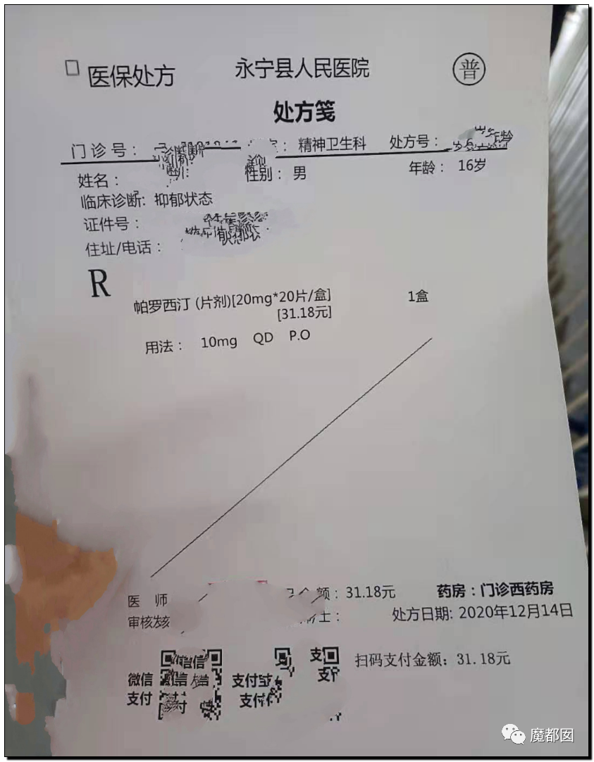 這孩子因為上網課被數學老師罵了長久,最後患上抑郁症,這是醫院處方: