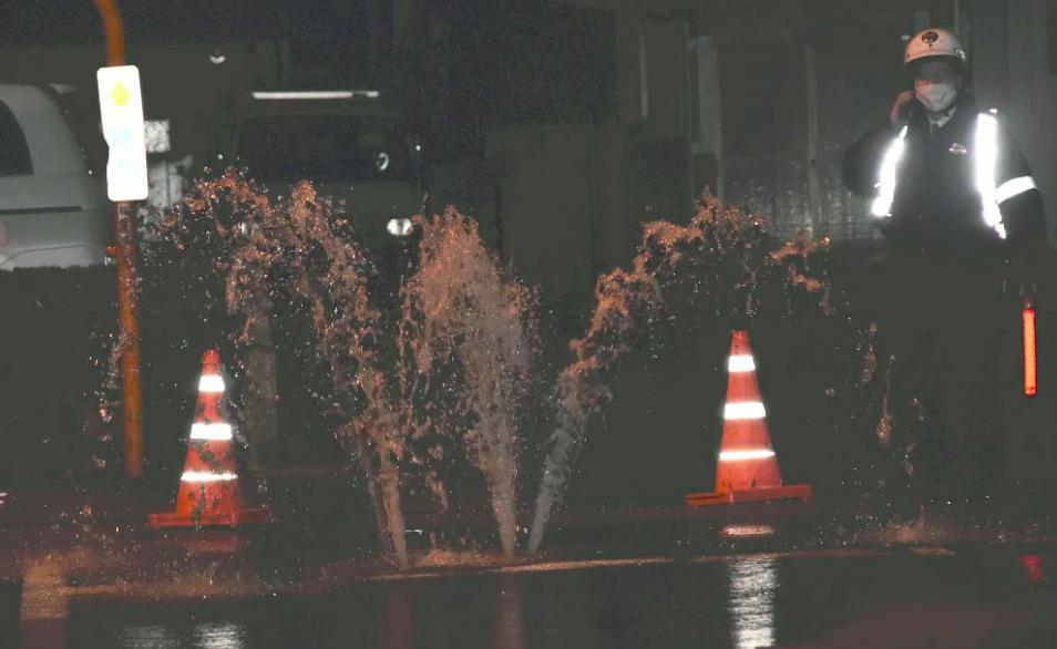 福島市壹街道路面因地震而致地下污水噴湧而出。圖源:《讀賣新聞》
