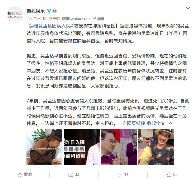 有消息稱,吳孟達在農歷年前身體狀況轉差,往時都有在過年過節發短訊跟朋友問好的他,但這次農歷年,朋友們都收不到吳孟達的訊息,發訊息問好亦沒收到回復,大家都很擔心。- 新聞來源於其它媒體,內容不代表本站立場!