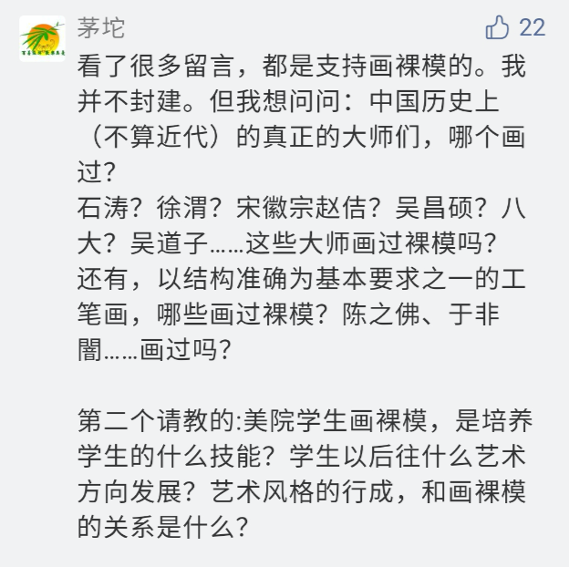 这居然也能争议上了,让你有一种年代上的混乱感。美术课写生能不能画人体,就跟说相声能不能报菜名一样,天地良心,行业基本功,你以为这根本是不需要讨论的事,什么年代了啊,还讨论这个?有点出息没有。在我读小学的九十年代,正经媒体上也早都不讨论这个了,谁讨论谁傻,中国,早就进步了。