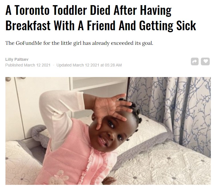 (加西網綜合)多倫多壹個3歲女孩,在和朋友共進早餐後突然死亡,目前死因仍在調查中。