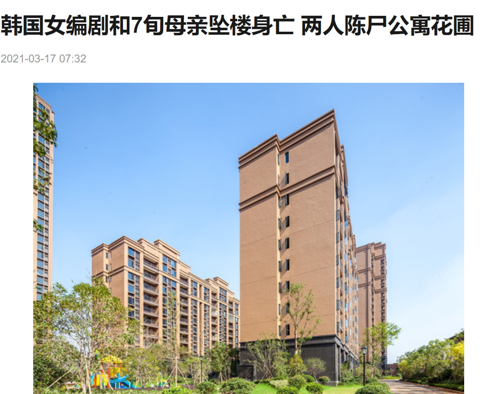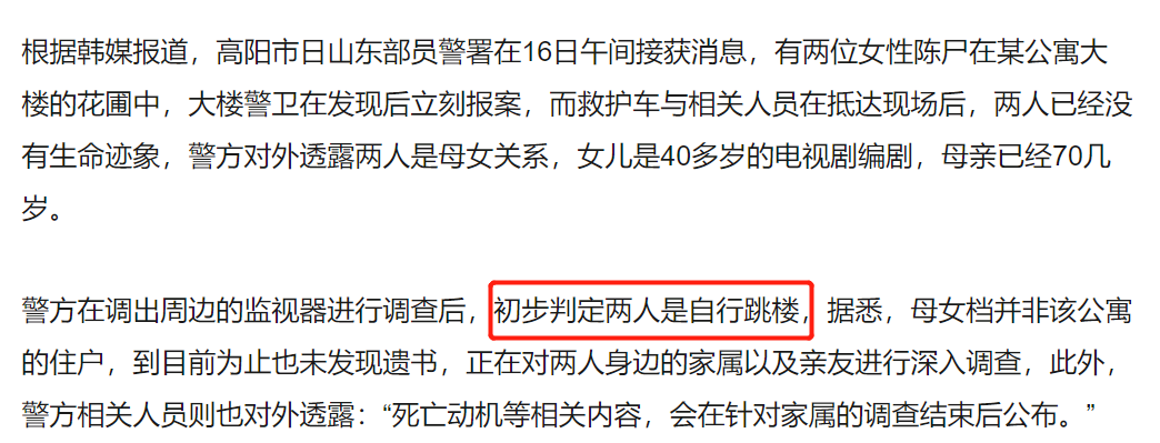3月17日,據媒體報道,韓國壹名女編劇與70幾歲的母親壹同墜樓身亡,兩人的遺體在某公寓內被發現,死亡原因疑似是輕生,警方目前也在調查中。