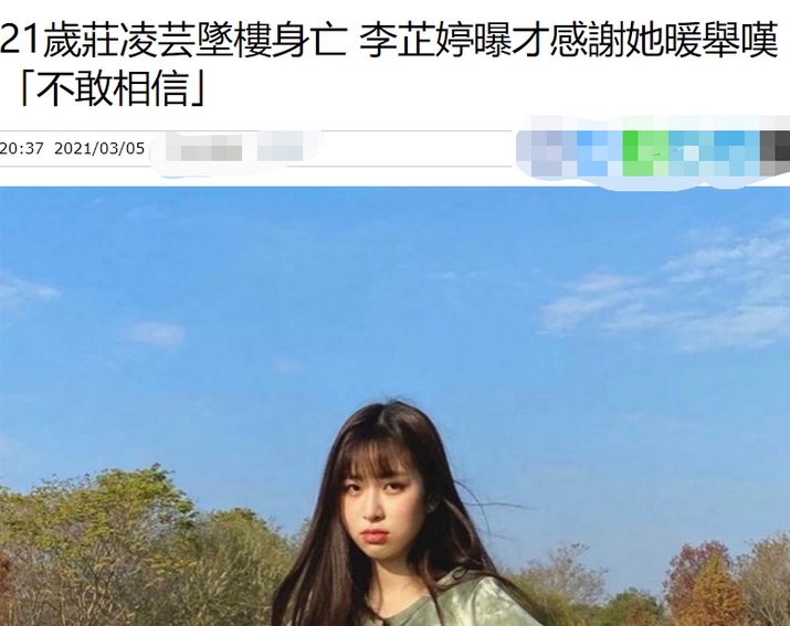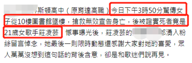 近期發生這樣墜樓的慘案已經不是第壹次了,就在3月5日,壹名年僅21歲的女歌手莊凌芸從母校墜樓。