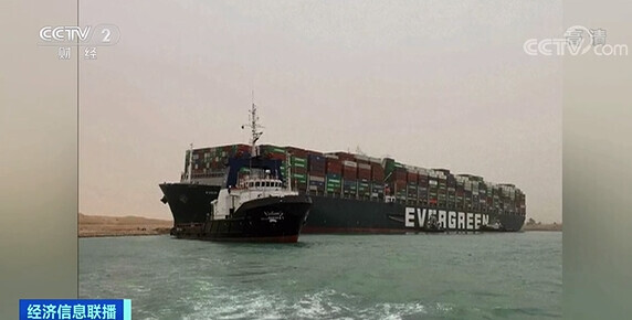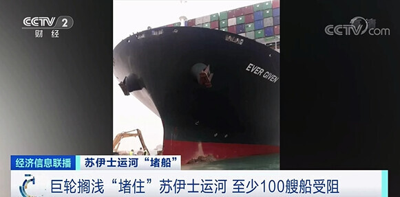 報道稱,這艘集裝箱貨輪懸掛巴拿馬國旗,駛往荷蘭鹿特丹,途中疑似遭到強風吹襲,導致偏離航道,於23日早上在蘇伊士運河擱淺。
