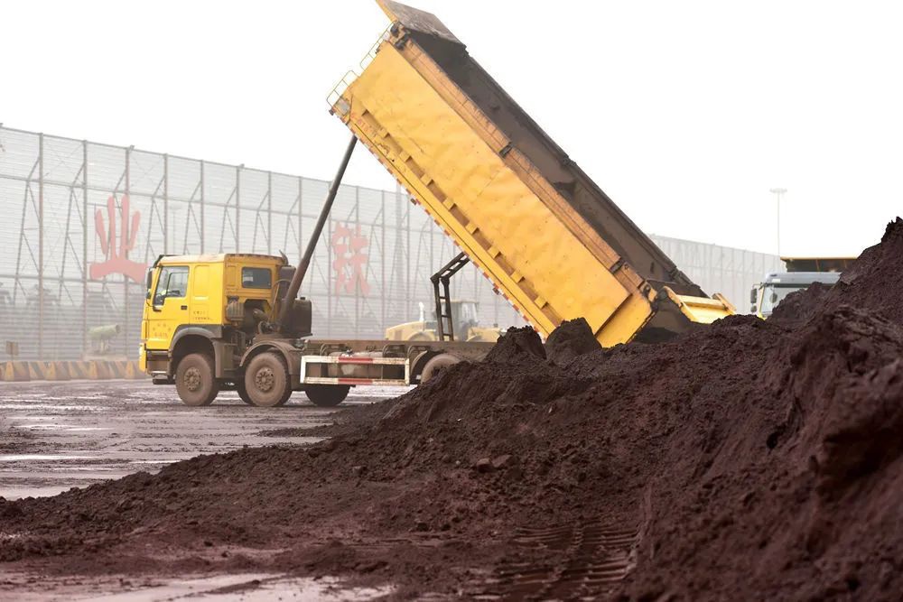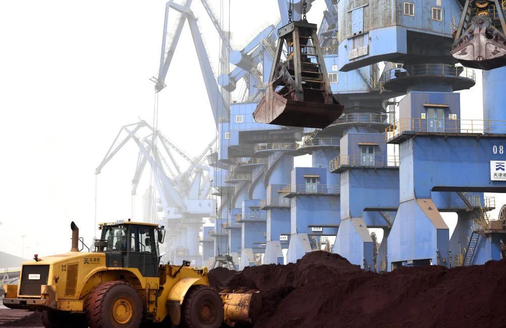 3月28日,天津港南疆碼頭,數台門座式起重機緊張作業,將紅褐色的粉末裝上貨輪。