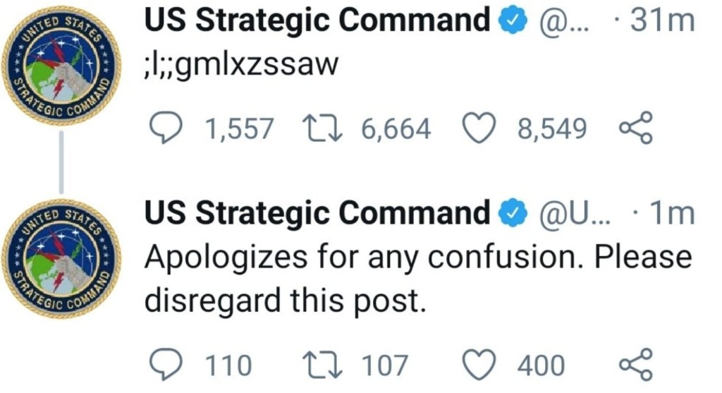 (加西網綜合)美國戰略司令部的官方推特賬號,在3月28日晚上發布了壹條由英文字母和標點符號組成的神秘推文,“;l;;gmlxzssaw”,隨後不久刪除。