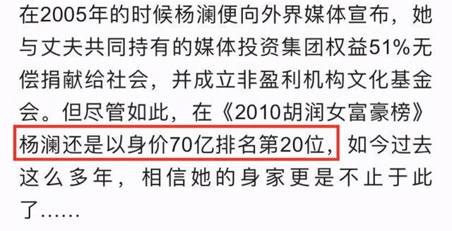 早在2010年,楊瀾就以70億的身家登上胡潤女富豪排行榜。她不僅有著優秀的專業素養,在文化運營方面也有著極大的話語權,因此地位很高。