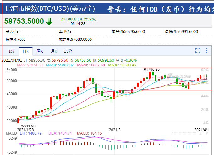 比特幣“拉鋸戰”已經持續了半個月。比特幣價格近2日再次漲至60000美元關口附近。3月31日最高價59795.60美元,4月1日凌晨最高價也是沖到59795.60美元。