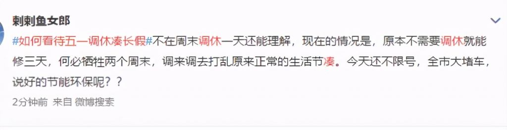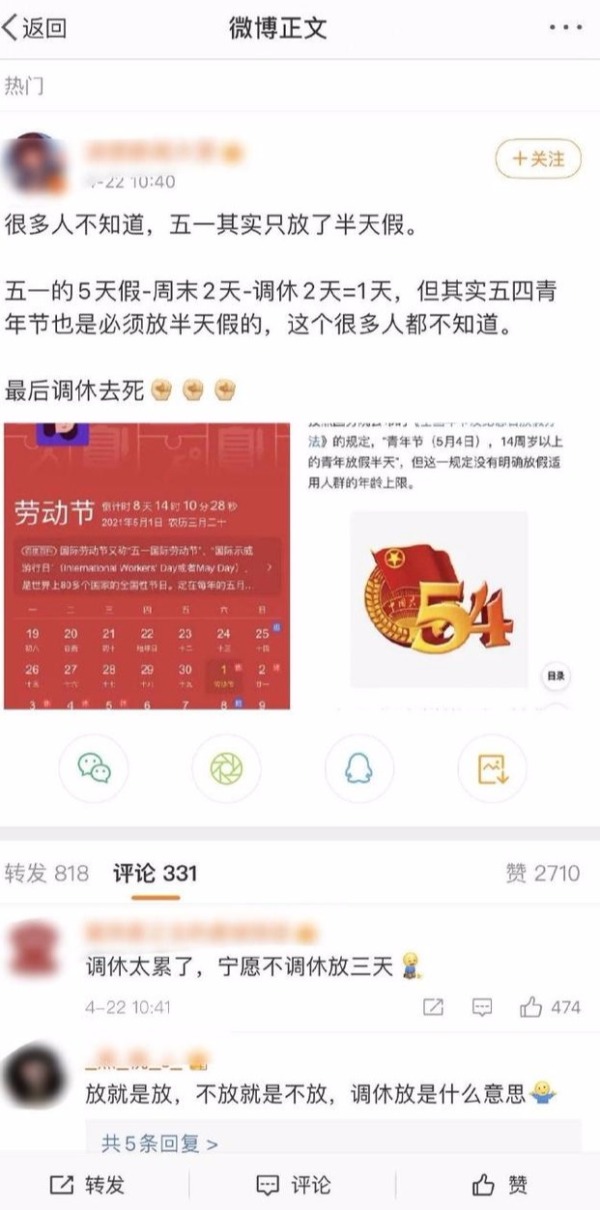 今天距离五一小长假只有几天的时间了,近日关于五一调休的话题相继冲上微博热搜。网友吐槽称,除了两天周末和两天调休,其实只放了一天假,而此安排也约等于毁了假期前后两个周末。还有网友表示五四青年节28岁以下青年本就应该有半天假,这么算的话五一只放了半天假。