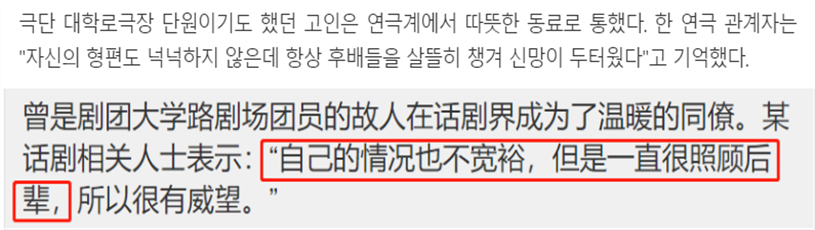 她的話劇同事回憶起她,誇贊她是壹個溫暖的人,說她自己情況也不富裕,但是壹直很照顧後輩,很有威望。