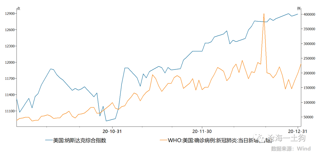 在美國疫情最嚴重的的11和12月,納斯達克指數累計上漲18.12%,強得壹塌糊塗。我們不得不做出壹個很違心的總結:疫情有助於助推股市上漲。