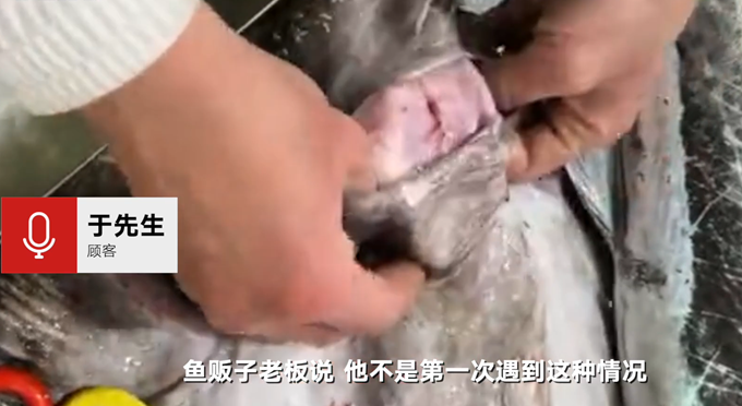 5月5日,山东烟台的于先生买鱼时发现鱼肚鼓胀,于是让商贩剪开鱼肚子,结果发现鱼肚内有一个白色塑料打包盒。他表示,商贩自称不是第一次遇到这种情况,之前在鱼肚里还发现过易拉罐。