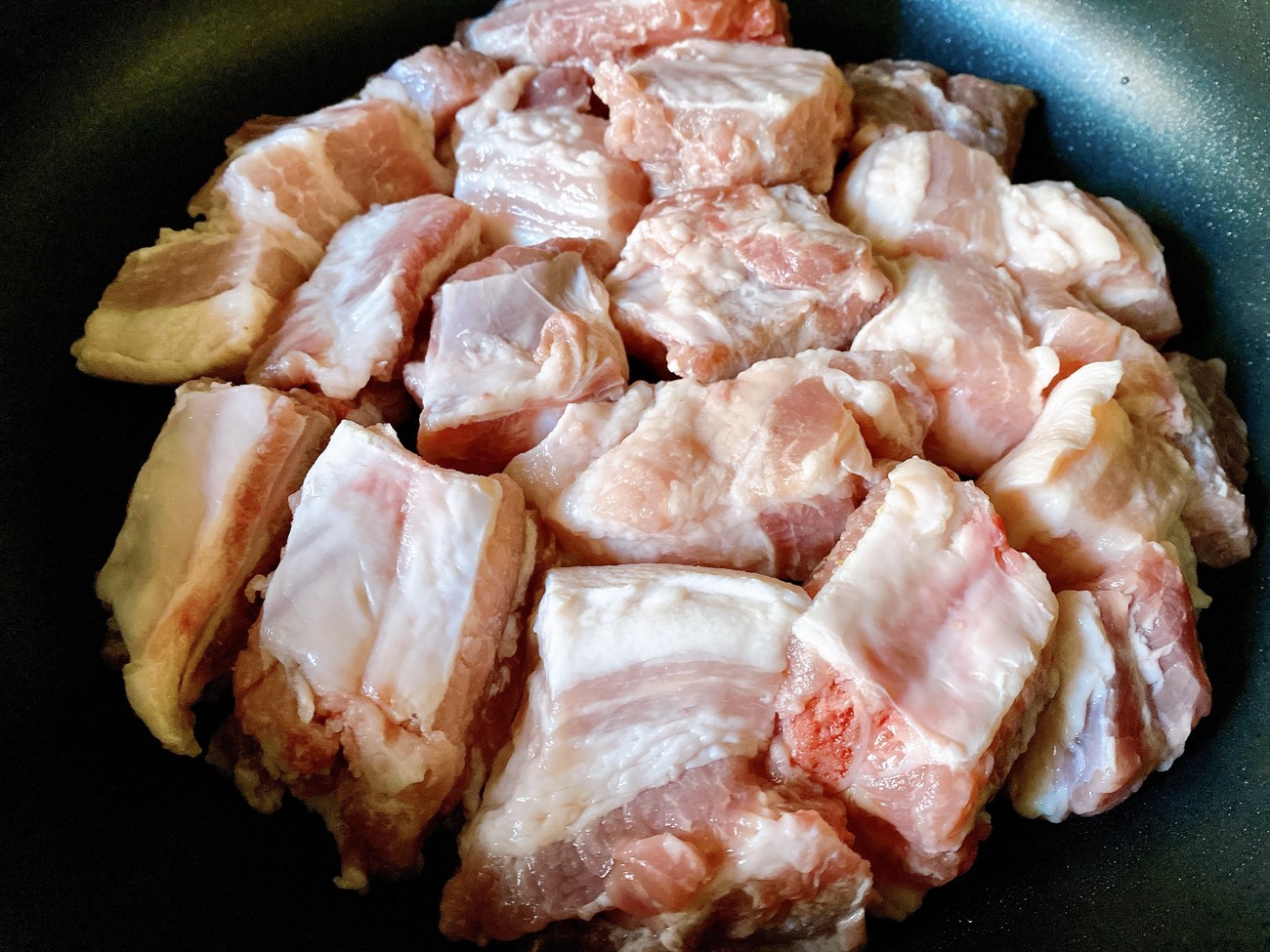 1、准備壹條上好的帶皮伍花肉,重量大約700克,伍花肉要選肥瘦相間的肉,這樣做出來才好吃,將伍花肉切成2.5厘米的大塊,准備壹個平底鍋,無需刷油,直接將肉放進鍋中,小火煎壹煎,煎出內部油脂。