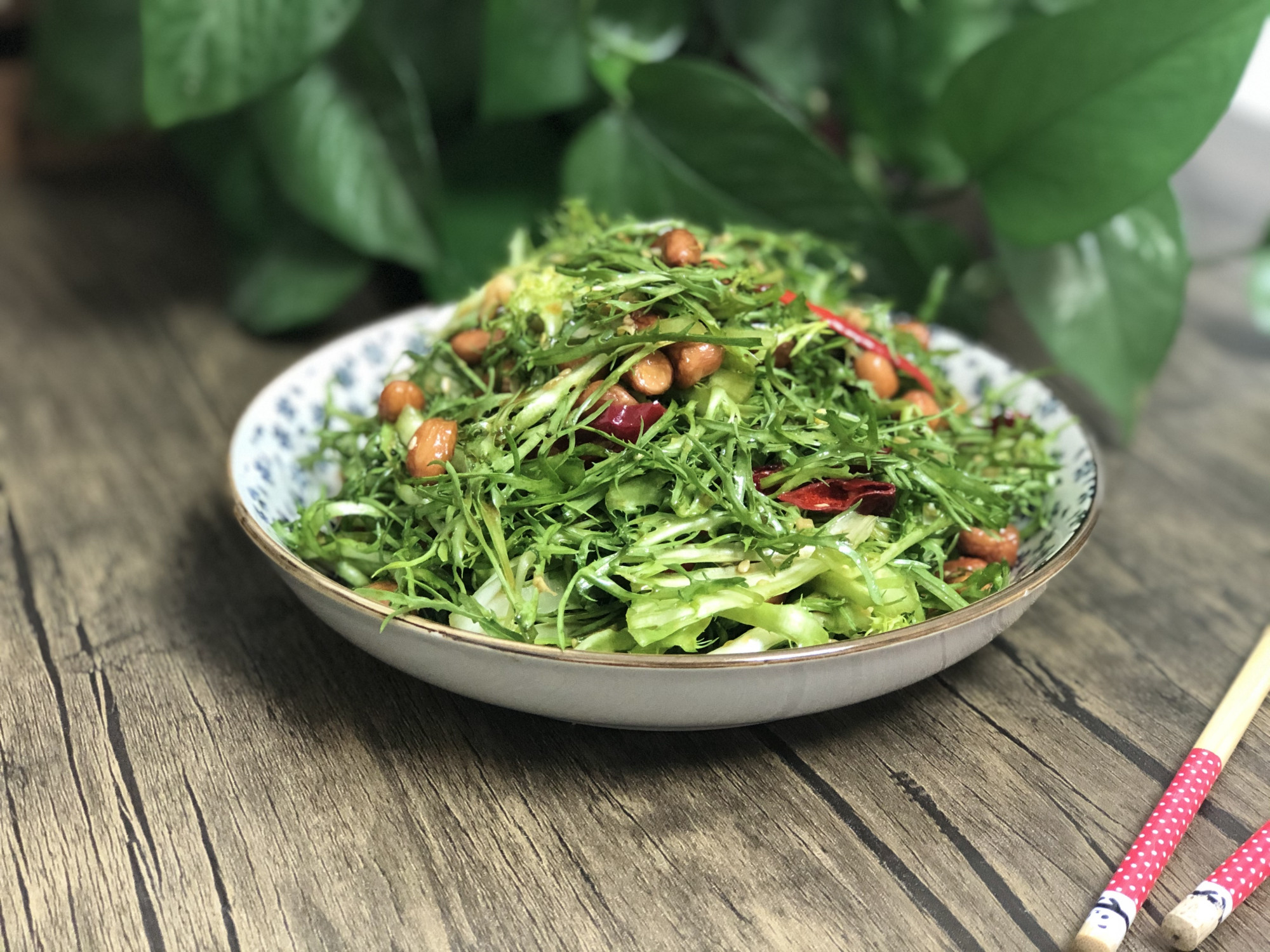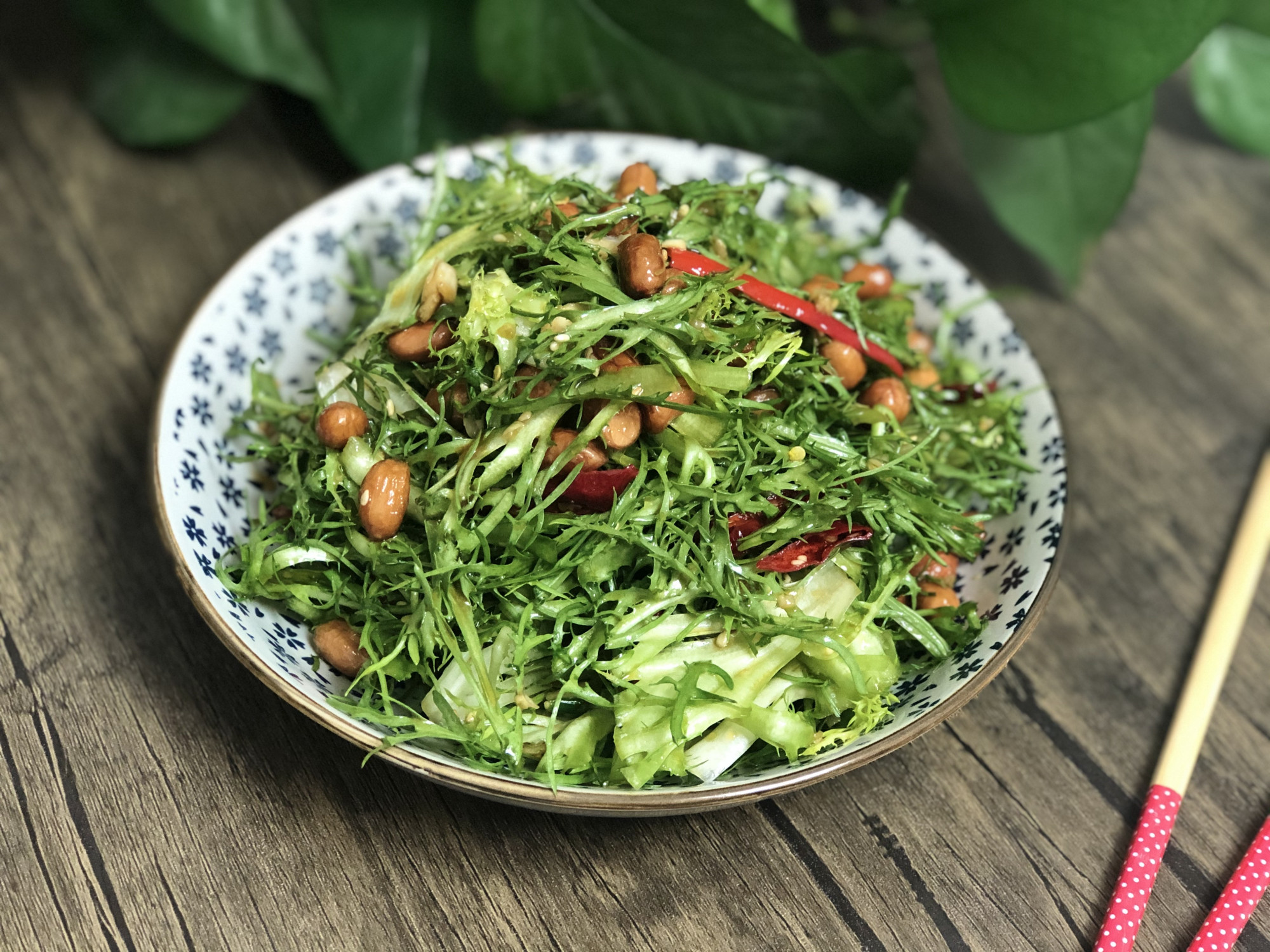 所需食材:苦菊、花生米、幹辣椒、大蒜、白芝麻、白糖、食鹽、生抽、陳醋