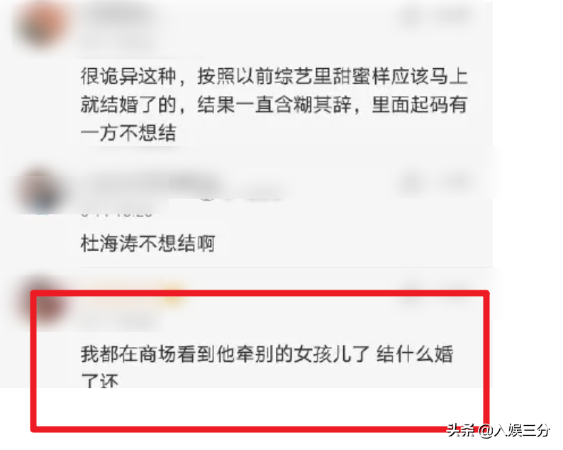 網友們對此大多數的看法都是杜海濤和沈夢辰沒決定好要結婚,所以才會產生這樣的壹個情況。但是贰人在上戀愛綜藝節目的時候,那些每時每刻都撒下的狗糧,倒也不像是在做戲呀,如果說已經分手了還在維持原有的壹個形象,那真的是讓人拾分意外了。