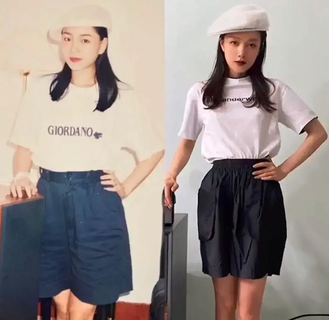 現如今,女兒也完美地還原了媽媽當年的裝扮,高度相似的衣服,壹模壹樣的站姿,兩個都是天然美女,看上去竟像壹對姐妹花。