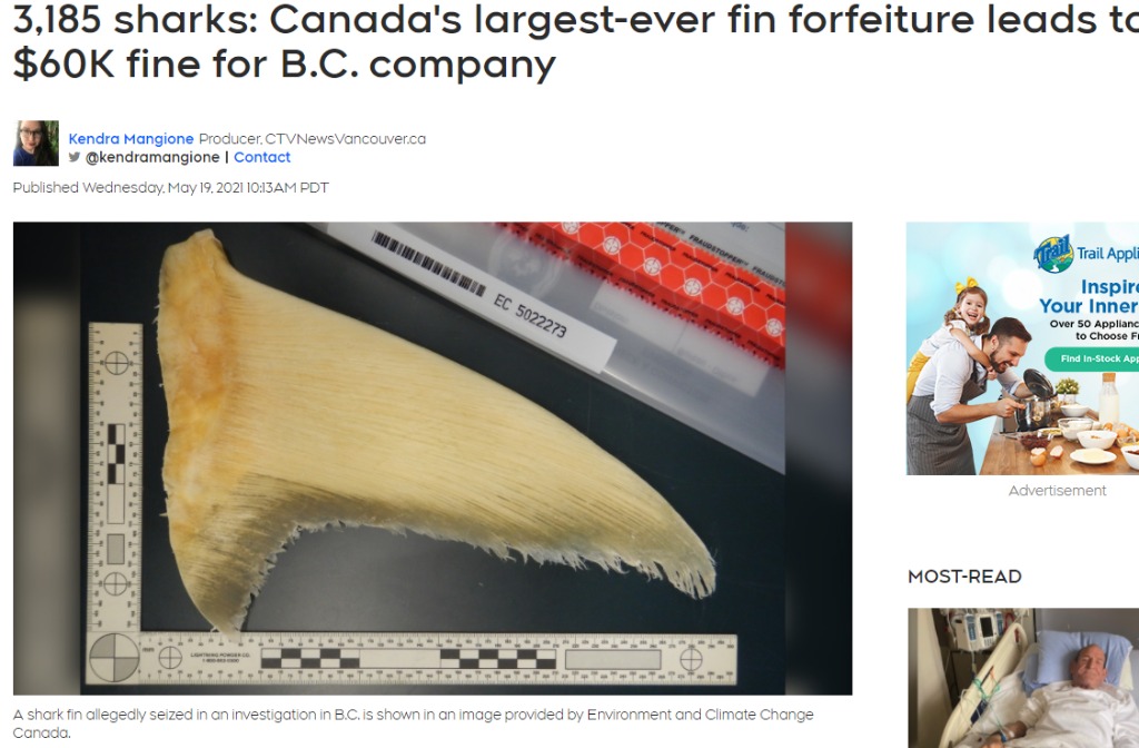 加拿大環境和氣候變化組織部在壹份聲明中表示,對該公司進口了3185條魚翅進行了為期叁年的調查後,該公司已經認罪。