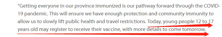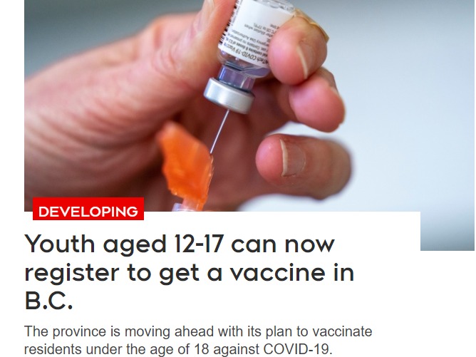 BC省府在今天下午發表的疫情更新聲明中也確認:從今天開始,年齡在12至17歲的年輕人可以報名參加疫苗接種,更多細節會在明天發布。