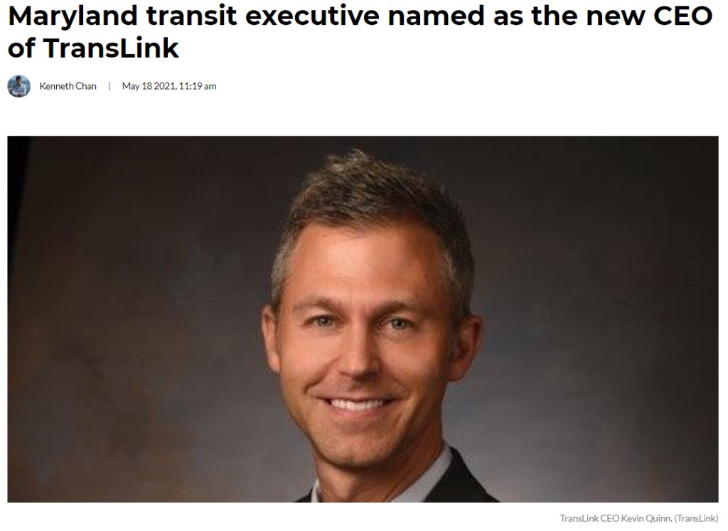 (加西網綜合)據DailyHive報道,周贰(5月18日),大溫運輸聯網(Translink)宣布,已任命馬裡蘭州運輸管理局(MTA)現任首席執行官(CEO)Kevin Quinn於今年夏天出任大溫運聯首席執行官壹職,並於7月19日正式履新。