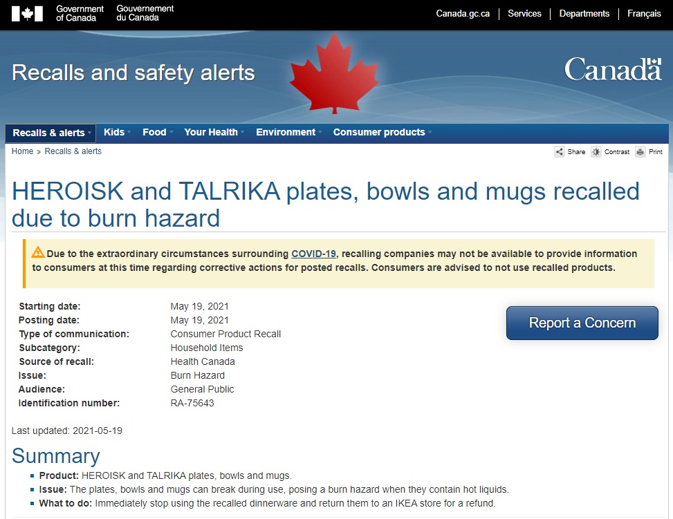根據衛生部於5月19日發布的召回通知,涉及召回的宜家(IKEA)希羅斯HEROISK 和塔利卡TALRIKA系列彩色餐具,包括碗、盤和杯子,因涉及召回產品在使用過程中可能會破裂,並可能由於其中所盛的高溫食物滲漏造成燙傷風險。加拿大全國范圍在2019年8月至2021年5月共售出11,443套。