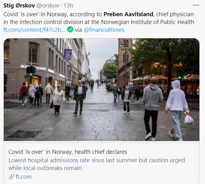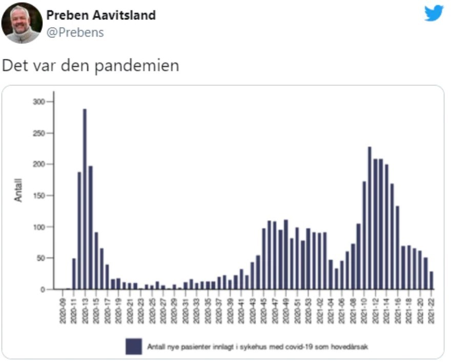 挪威公共衛生研究所、領導挪威抗疫的首席醫師Preben Aavitsland昨天發推說:挪威的大流行疫情已終結。