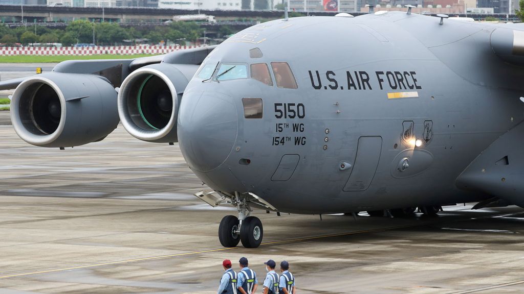 一架美国空军C-17运输机本周日(6月6日)7时19分降落在台北松山机场。(美联社)