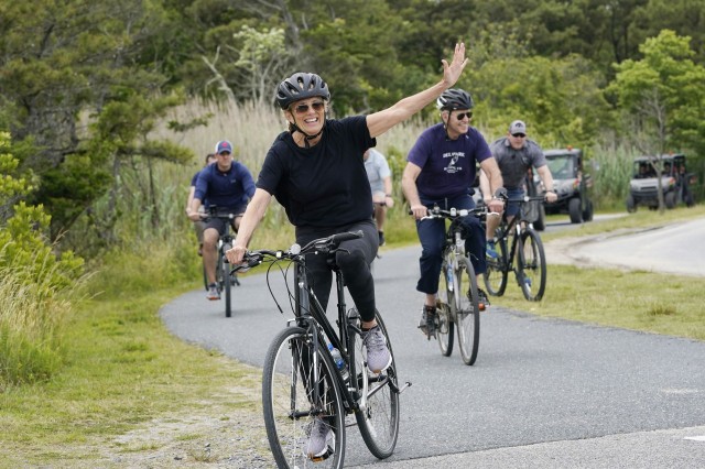 2021年6月3日,美国总统拜登和第一夫人吉尔(Jill Biden)骑单车。(AP)