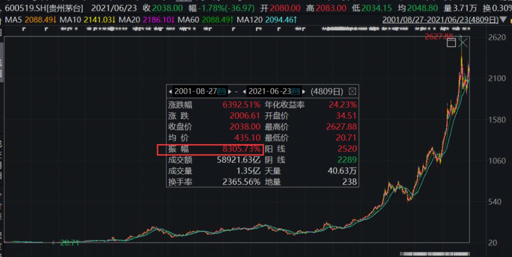 而貴州茅台的股票自 2001 年上市,20 年來,最高漲幅超過 8305%。