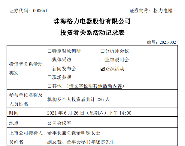 同壹時間,格力電器還公布了《投資者關系活動記錄表》,記錄了格力電器董事長董明珠和公司副總裁、董事會秘書鄧曉博在6月26日下午接待共計226名機構及個人投資者的交流記錄。這壹記錄也可以被視作董明珠在員工持股計劃後的首度發聲。