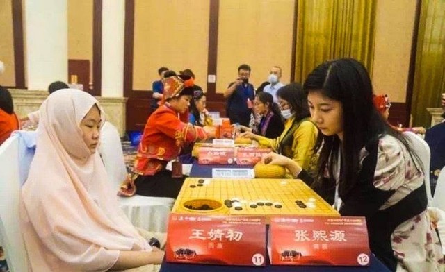 中國回族棋手王婧初(左)因穿著傳統服裝參加圍棋賽,被指為凸顯宗教極端主義。(取自微博)