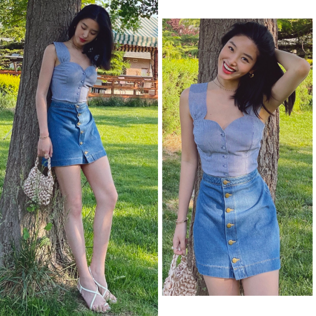 楊采鈺最近私服也穿了很多牛仔單品,最喜歡這套小背心×牛仔短裙,她總能把法式風拿捏得剛剛好。