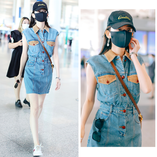 古力娜扎最新的機場look穿了Philosophy的拼色牛仔裙,配上鴨舌帽小白鞋,特別甜酷范。