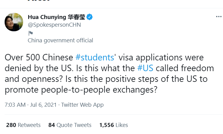 中國外交部發言人趙立堅在7月6日的例行記者會上稱,近期針對這500余名敏感專業的中國留學生的簽證限制是“延續了川普政府時期的遺毒”,嚴重破壞中美正常人文交流和教育合作,是“開歷史倒車”。中國已向美方提出嚴正交涉。