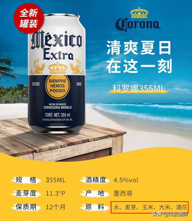 號稱全球銷量第壹的墨西哥科羅娜啤酒,不僅含大米,還含玉米,麥芽濃度同樣可以達到11.3度。對於含大米的啤酒這個事兒,我的觀點是:垃圾啤酒不見得都含大米,更不代表含大米的啤酒就是垃圾啤酒。