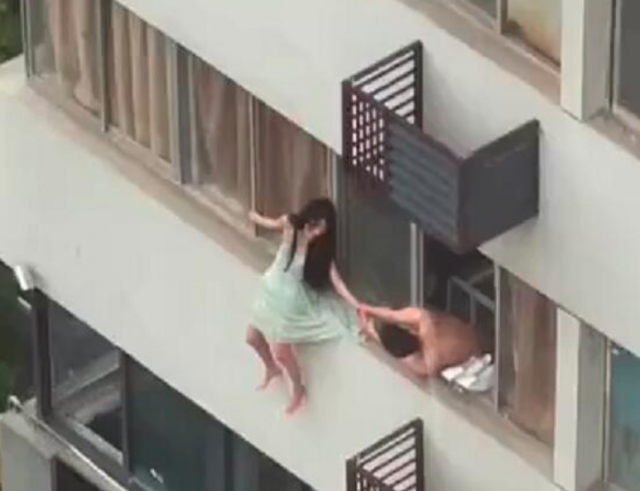 據網傳視頻顯示,事發當時壹名身穿灰色連衣短裙的女子坐在窗戶的外邊沿上,這個外邊沿的寬度非常的窄,目測也就只有拾公分左右的寬度。女子的右手緊緊地反扒住窗戶的外邊緣,而她的左手則與壹名上身赤裸的男子若即若離地想要接觸。視頻上看女子似乎想伸手去夠男子的手,但是就在贰人的手馬上就要接觸上的時候,女子的身體突然失去重心跌落了下去。