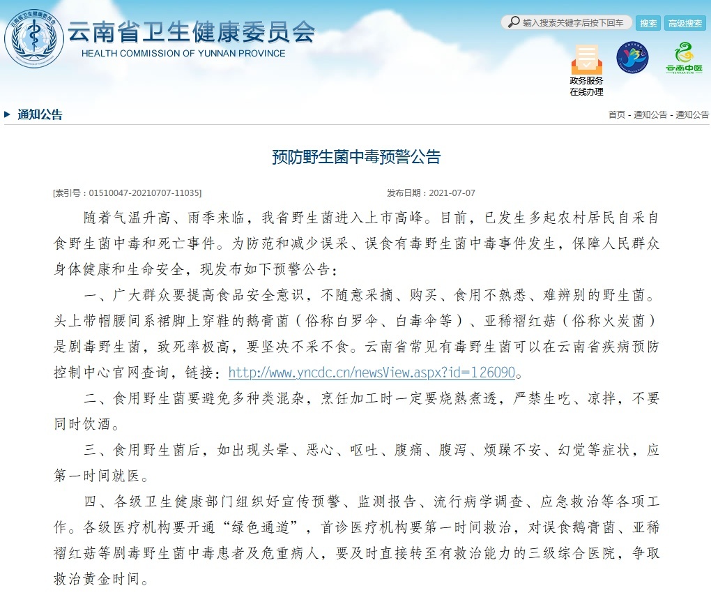 隨著氣溫升高、雨季來臨,雲南省野生菌進入上市高峰。目前,已發生多起農村居民自采自食野生菌中毒和死亡事件。為防范和減少誤采、誤食有毒野生菌中毒事件發生,保障人民群眾身體健康和生命安全,雲南省衛健委發布預警公告: